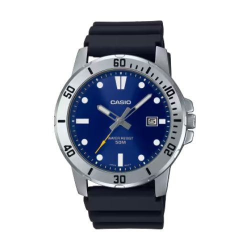 The Casio MTP-VD01 is a durable everyday watch featuring a resin band, Mineral Glass, and reliable Japan Movement. It offers 50-meter water resistance, a clear date display, and lightweight comfort at 79 g. With a 3-year battery life and accurate timekeeping, this model delivers simple, practical, and long-lasting performance.