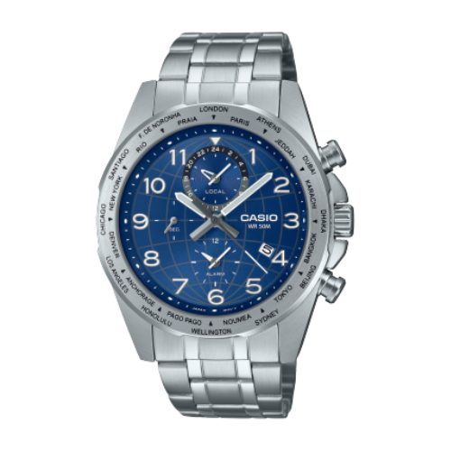 The Casio MTP-W500D Men’s Watch combines retro chronograph styling with modern functionality. Featuring Japan movement, a 3-hand analog display, and 3 sub-dials for world time, seconds, and alarm, it provides accurate timekeeping across 24 time zones. The stainless steel case and band with a one-touch 3-fold clasp ensures durability, while mineral glass and a screw lock back protect the watch. With 50-meter water resistance, a long-lasting 3-year battery (SR927W), and low battery warning, it’s perfect for men who value style, reliability, and global time functionality.