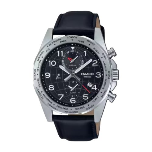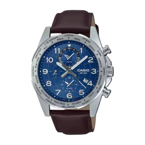 The Casio MTP-W500L Men’s Watch delivers a perfect blend of retro chronograph design and modern functionality. Featuring Japan movement, a 3-hand analog display, and 3 sub-dials for world time, seconds, and alarm, it keeps accurate time across 24 time zones. The genuine leather band adds elegance and comfort, complemented by a stainless steel case with mineral glass and a screw lock back for durability. With 50-meter water resistance, a 3-year battery (SR927W), and a low battery warning, this watch is ideal for men who value style, precision, and global functionality.